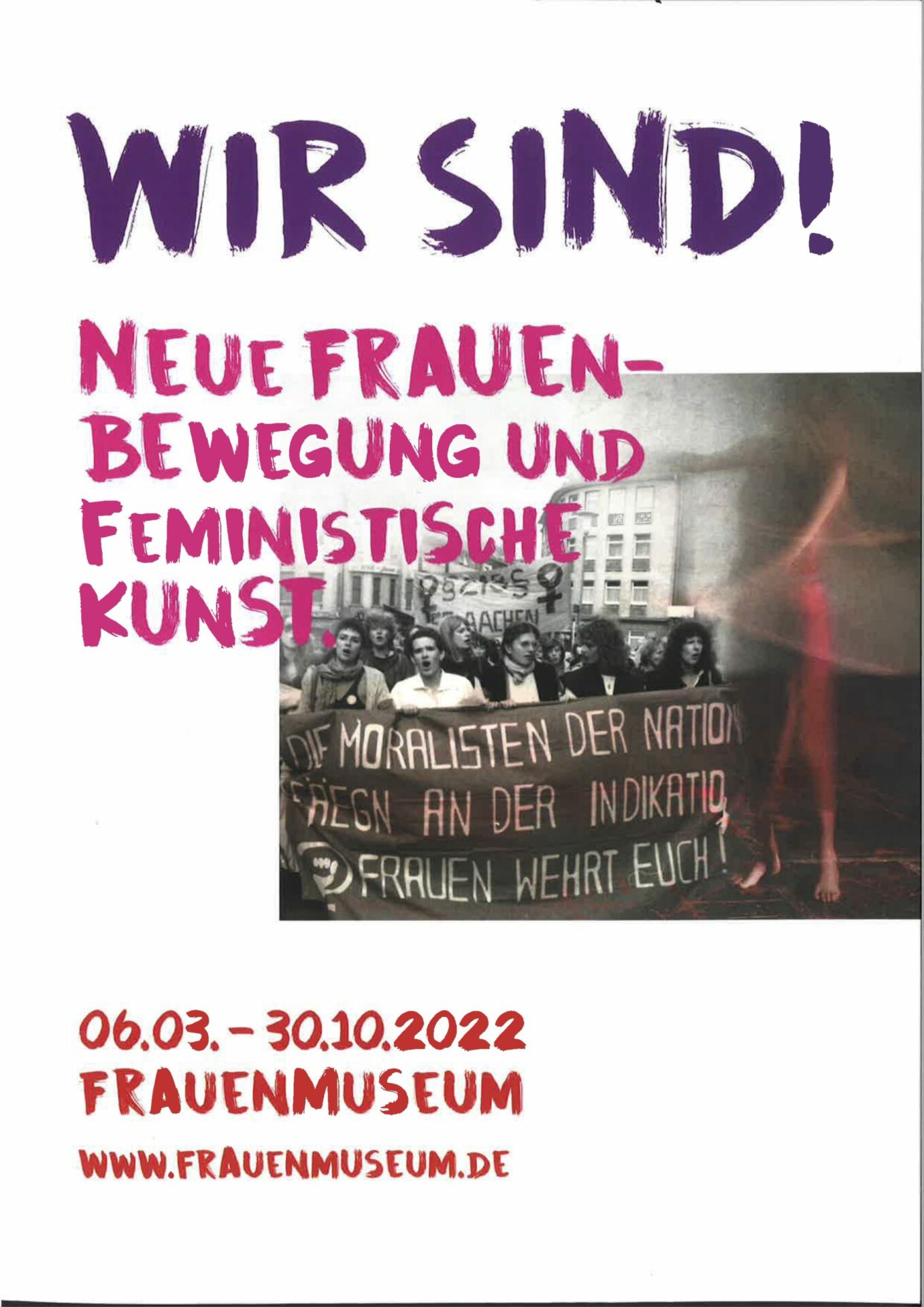 „Mein Bauch gehört mir!“ Unter dieser Losung vereinigten sich zehntausende Frauen, um den § 218 zu bekämpfen, den eigenen Körper zu erkunden, ihr Selbstbewusstsein zu trainieren und neue Frauenräume zu schaffen. Das Thema Gewalt gegen Frauen wurde aus den patriarchalen Ecken und familiären Tabuzonen gerissen. Lesben-Gruppen gründeten sich ebenso wie autonome Frauenzentren. Es wird deutlich: Frauen waren an vielen Umbrüchen nach 1968 in entscheidender Weise beteiligt. Vor diesem lila-bunten Panorama setzten Künstlerinnen einfallsreich und provokant die feministische Aneignung des Kunstraumes in Gang. „Das Private ist politisch!“ galt fortan auch in der Kunst. WIR SIND! versammelt Werke aus den Bereichen Video, Performance, Fotografie, Skulptur, Installation, Collage und Malerei. Wir präsentieren Arbeiten aus der hauseigenen Sammlung, den Depots der Künstlerinnen sowie öffentliche wie private Leihgaben. Vertreterinnen jüngster Tendenzen geben dazu Einblicke in die aktuelle feministische Kunstszene.